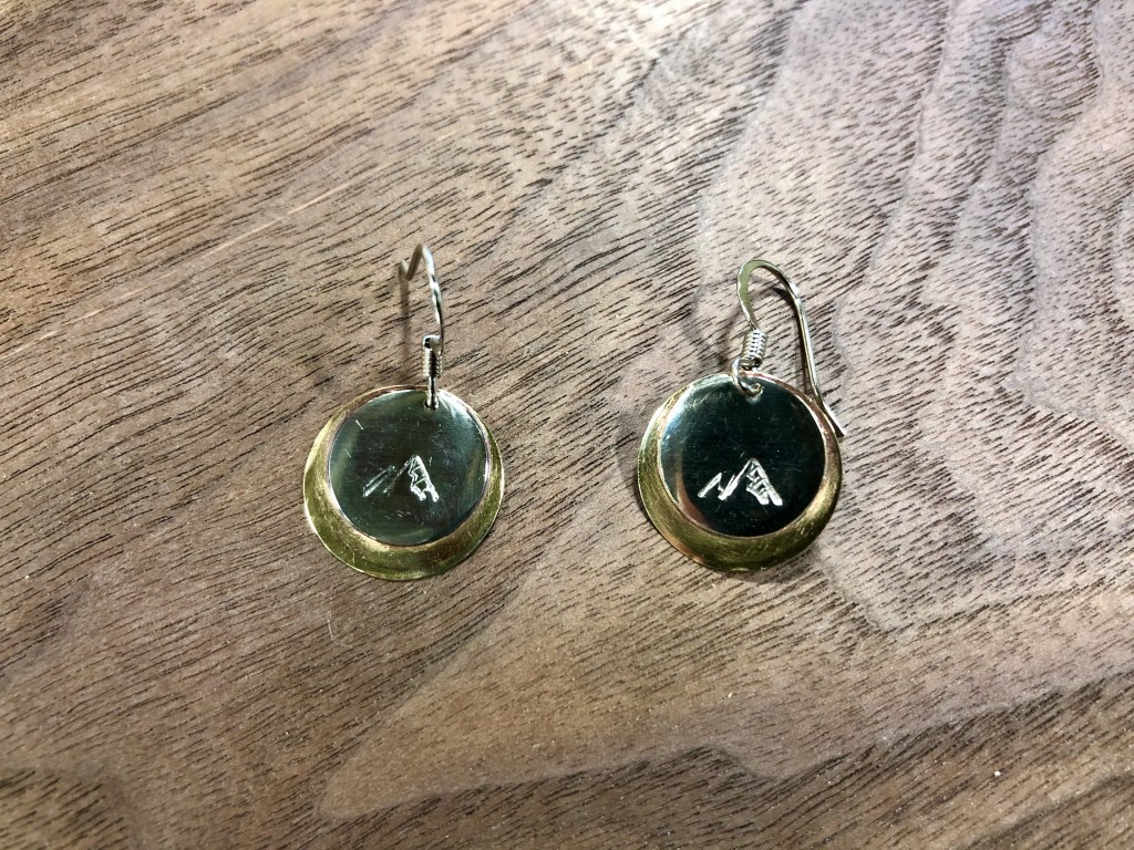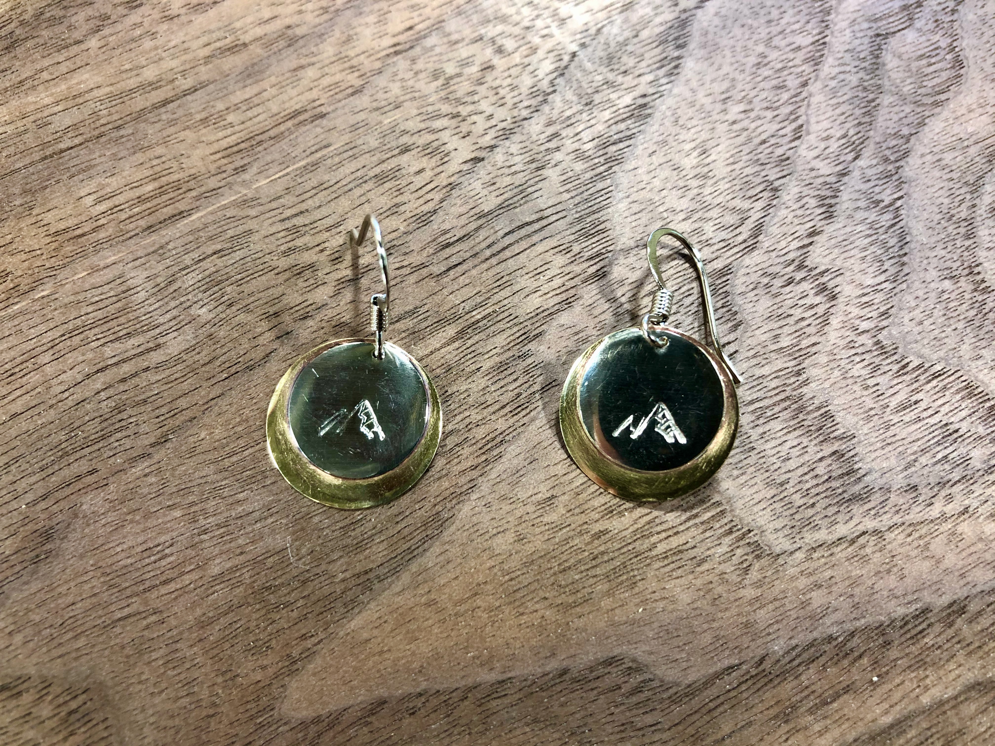 D.G. in Jewelry 11 went beyond his “eclipse” sweat-solder practise project and created these gorgeous earrings as a gift for his mom. Nickel silver and brass were used, as well as a sheet metal punch to get those perfect circles. Metals were sweat-soldered together, and his finishing touch was stamping a mountain design into both earrings. Beautiful work!