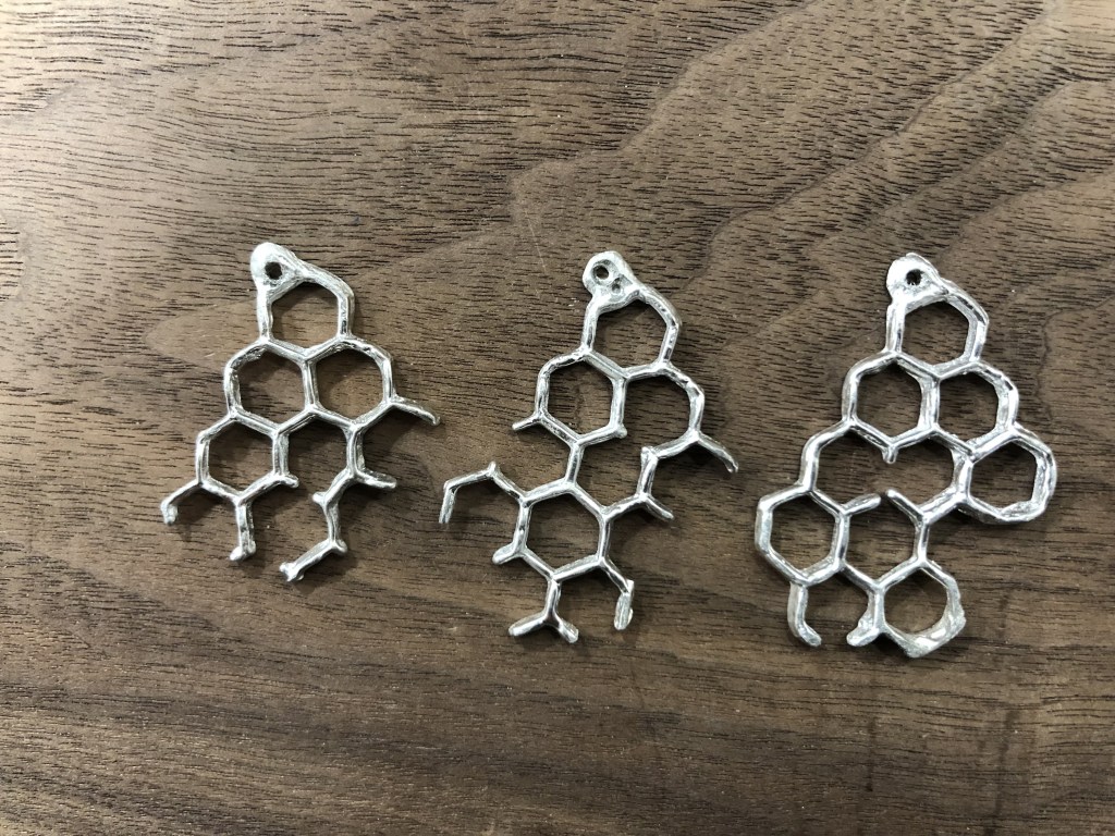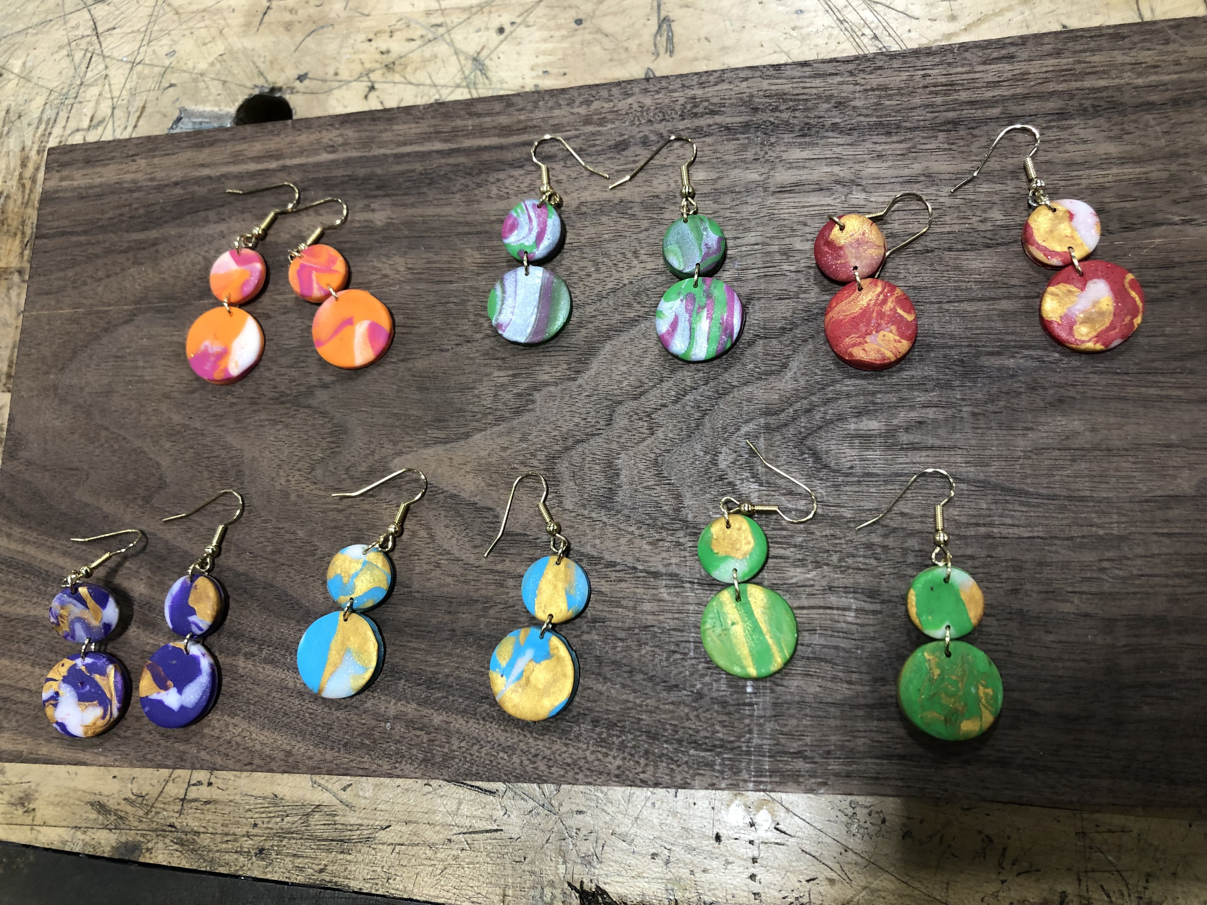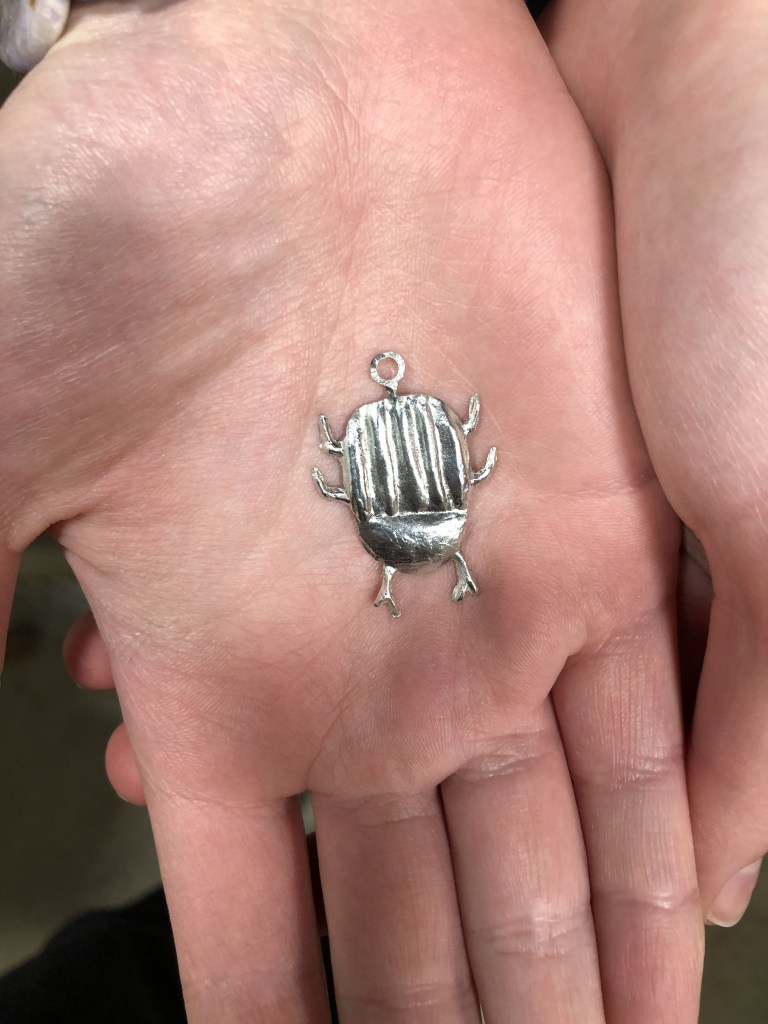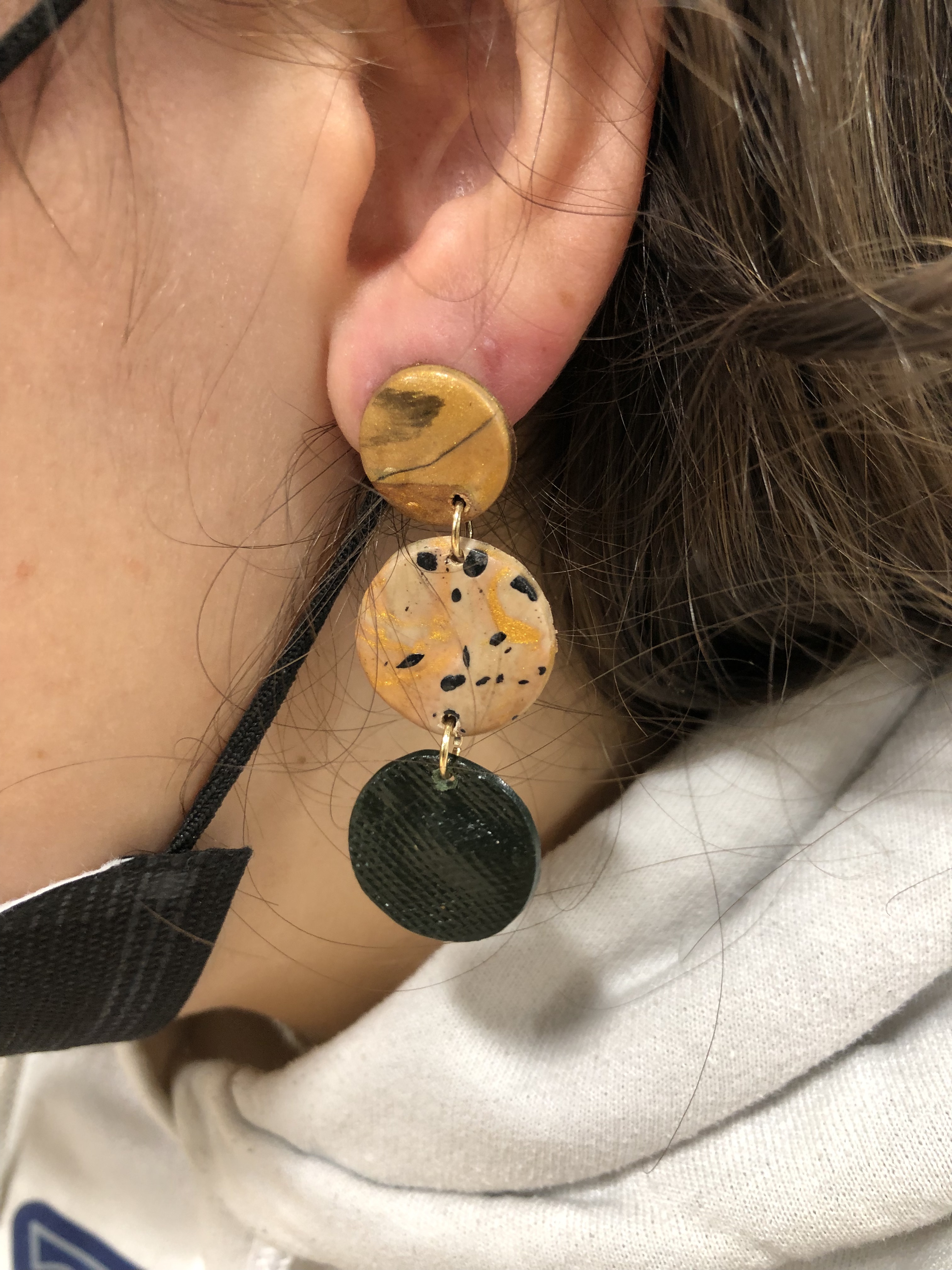 Some incredible projects from our Spring 2022 Jewelry 11/12 crew! Fidget ring featuring copper enamelled flower with a handmade sterling rivet made by S.V., Sterling silver feathered earcuffs made by K.C. (and worn to their grad ceremony in June!), and a stone set pendant by W.J.. Great job, everyone!