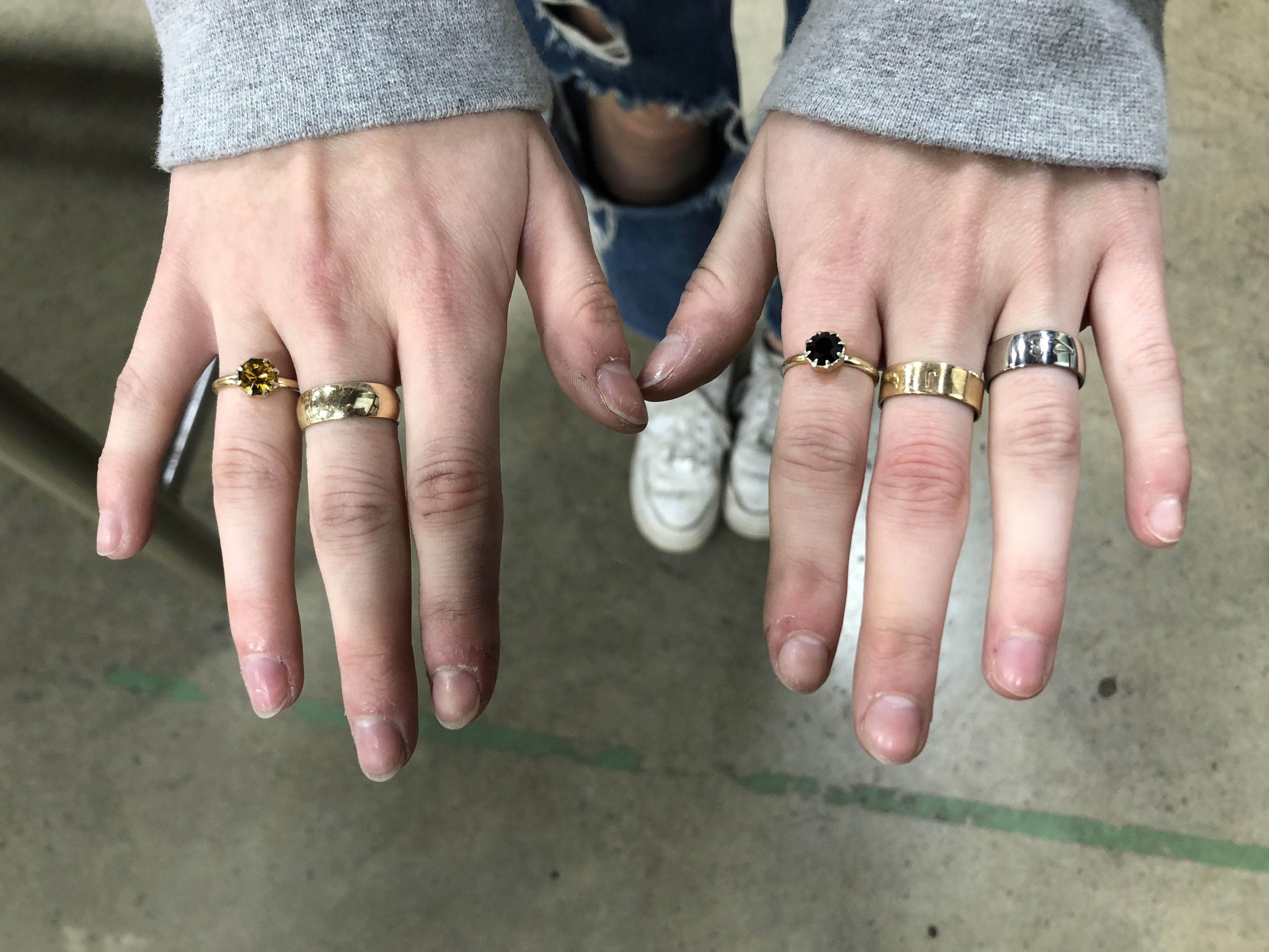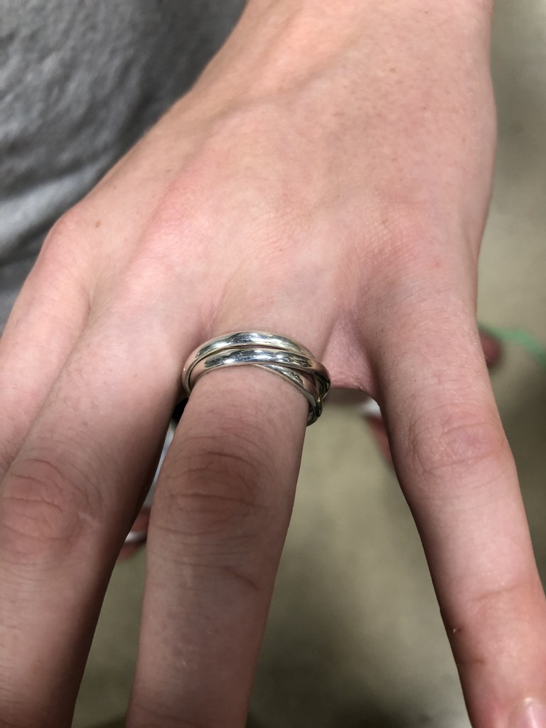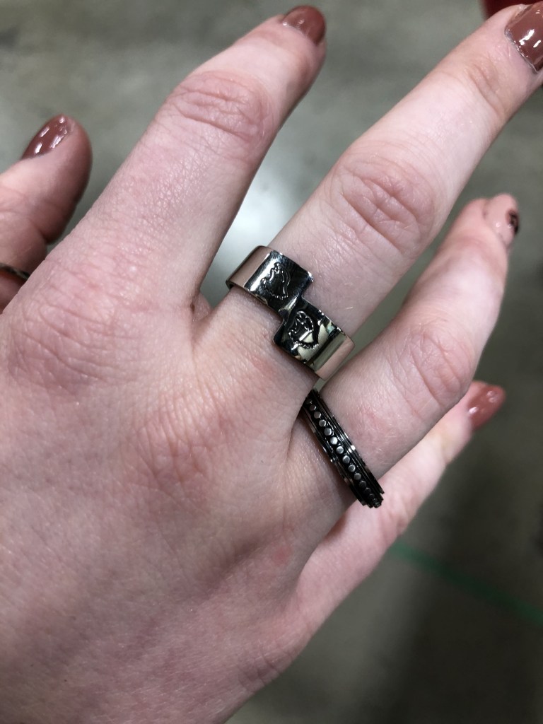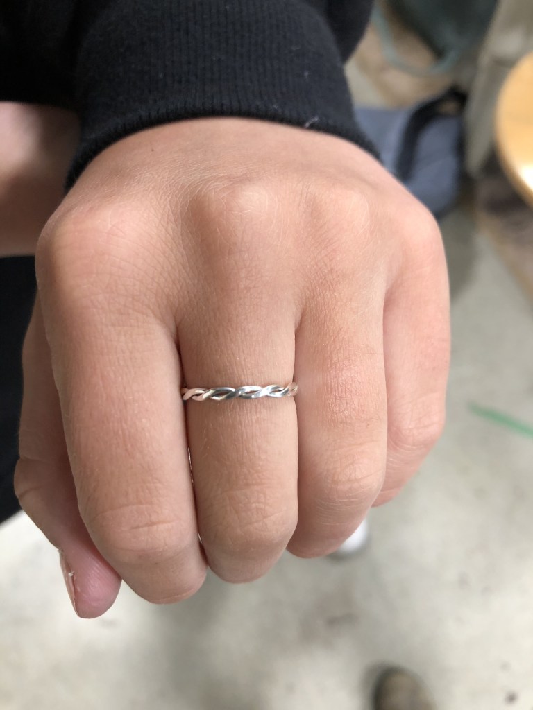 Senior students K.C. and D.G. created these self-directed ring projects. K.C. annealed, twisted, and forged the silver band ring and cut out the “V” ring with a jewellers’ saw. D.G. took on a challenge with this brass “ball ring”, where spheres were created by purposefully melting small pieces of brass wire, then soldering them onto a band. Excellent work!