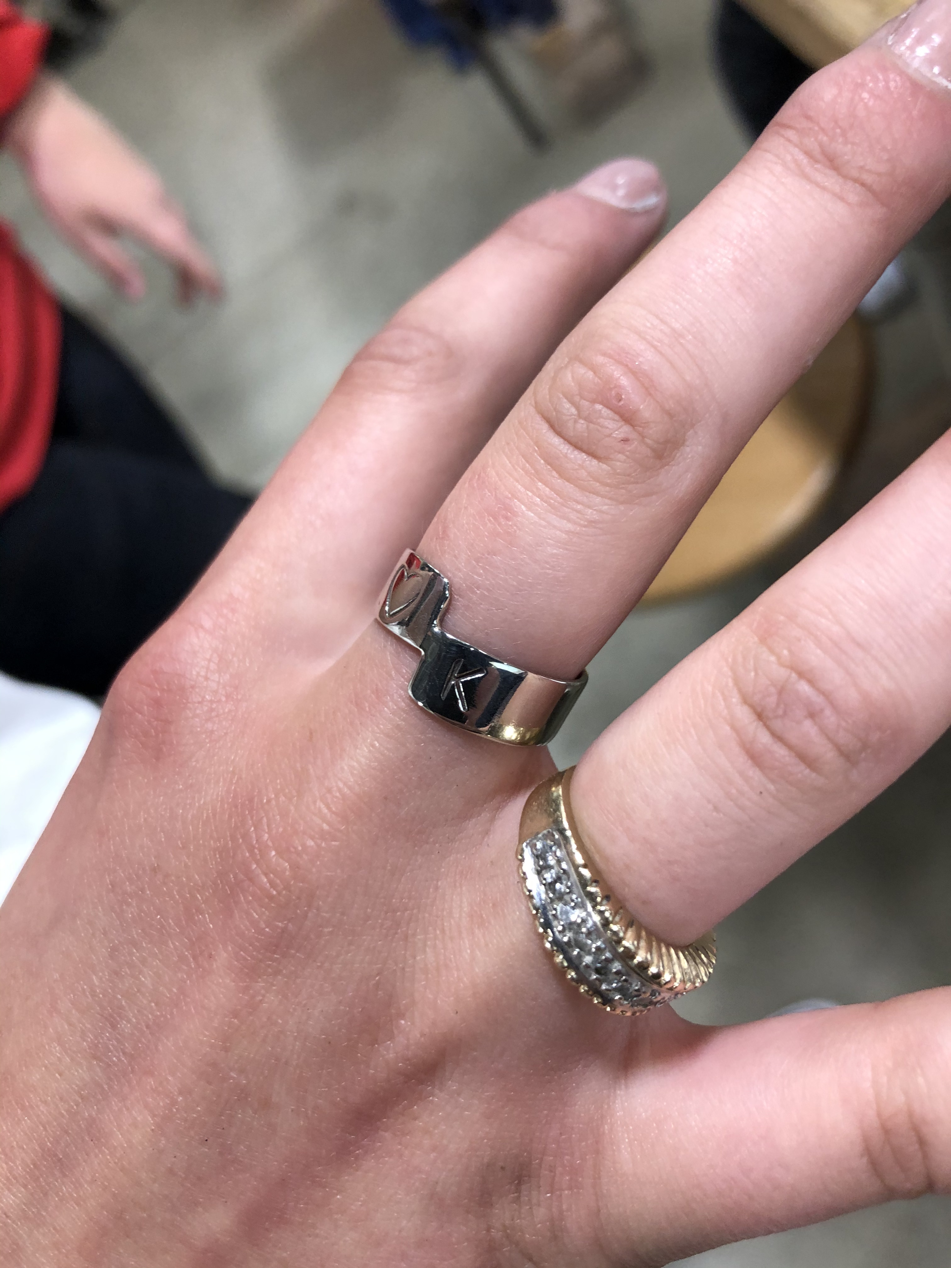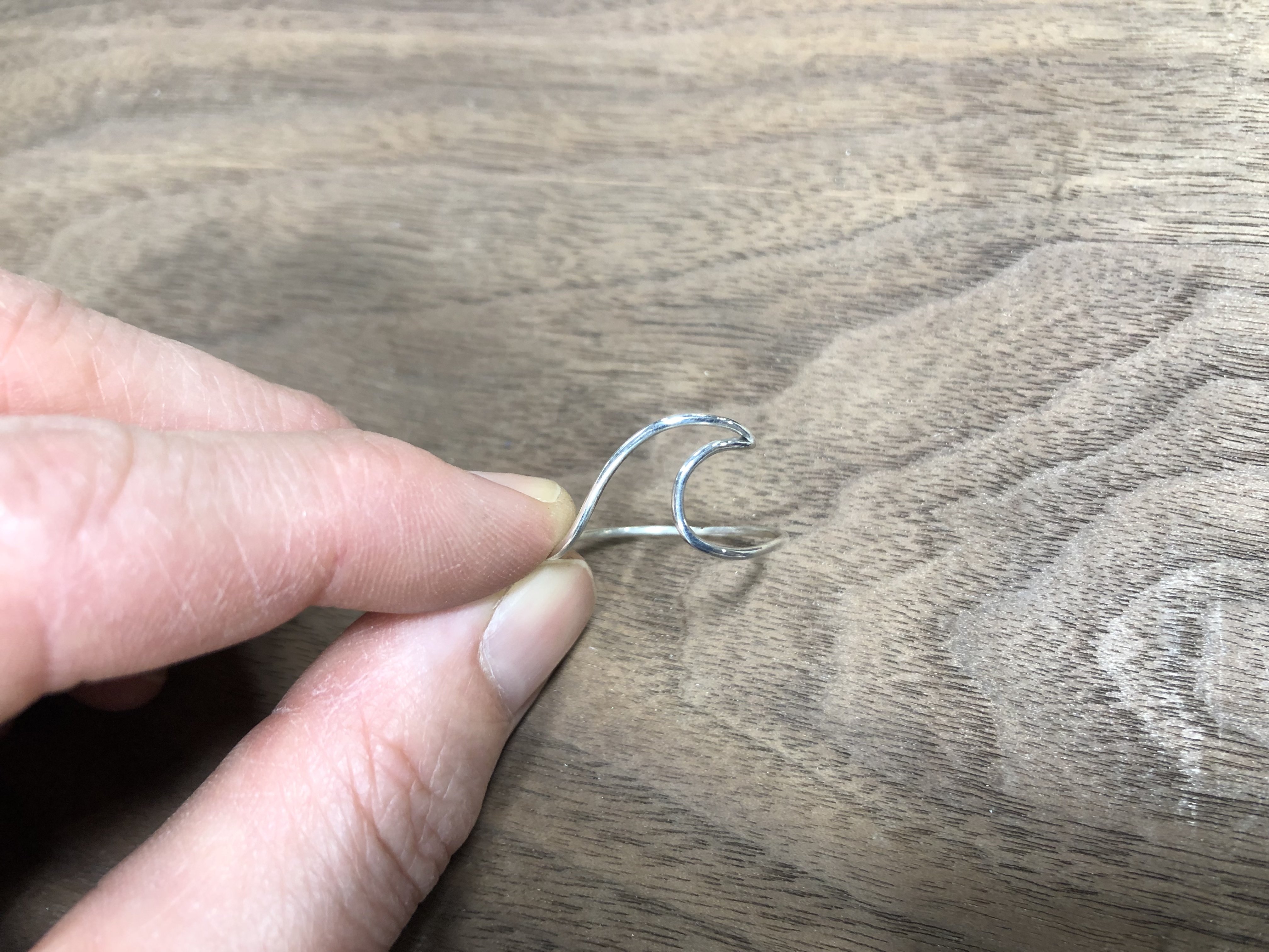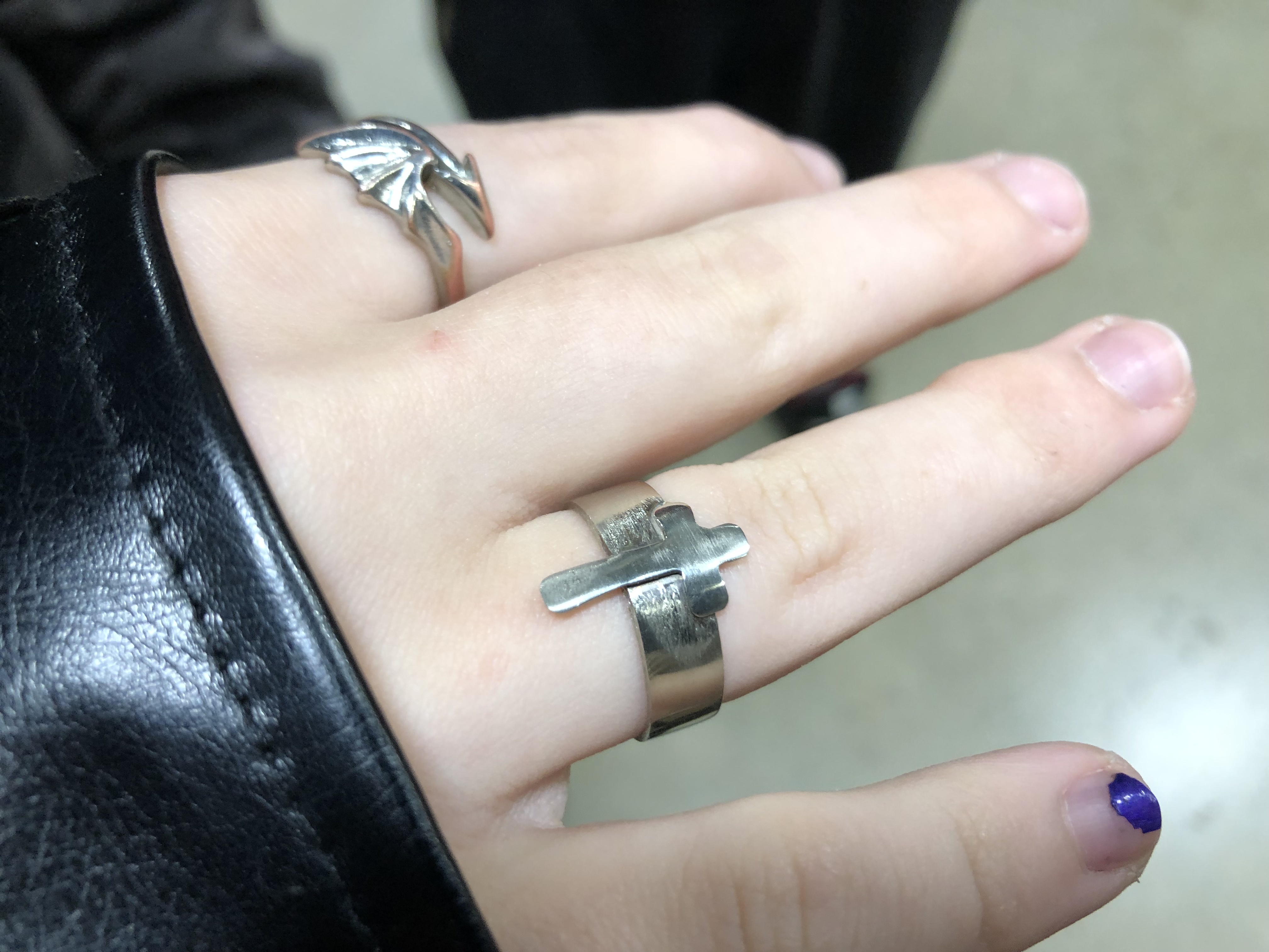 Senior students K.C. and D.G. created these self-directed ring projects. K.C. annealed, twisted, and forged the silver band ring and cut out the “V” ring with a jewellers’ saw. D.G. took on a challenge with this brass “ball ring”, where spheres were created by purposefully melting small pieces of brass wire, then soldering them onto a band. Excellent work!