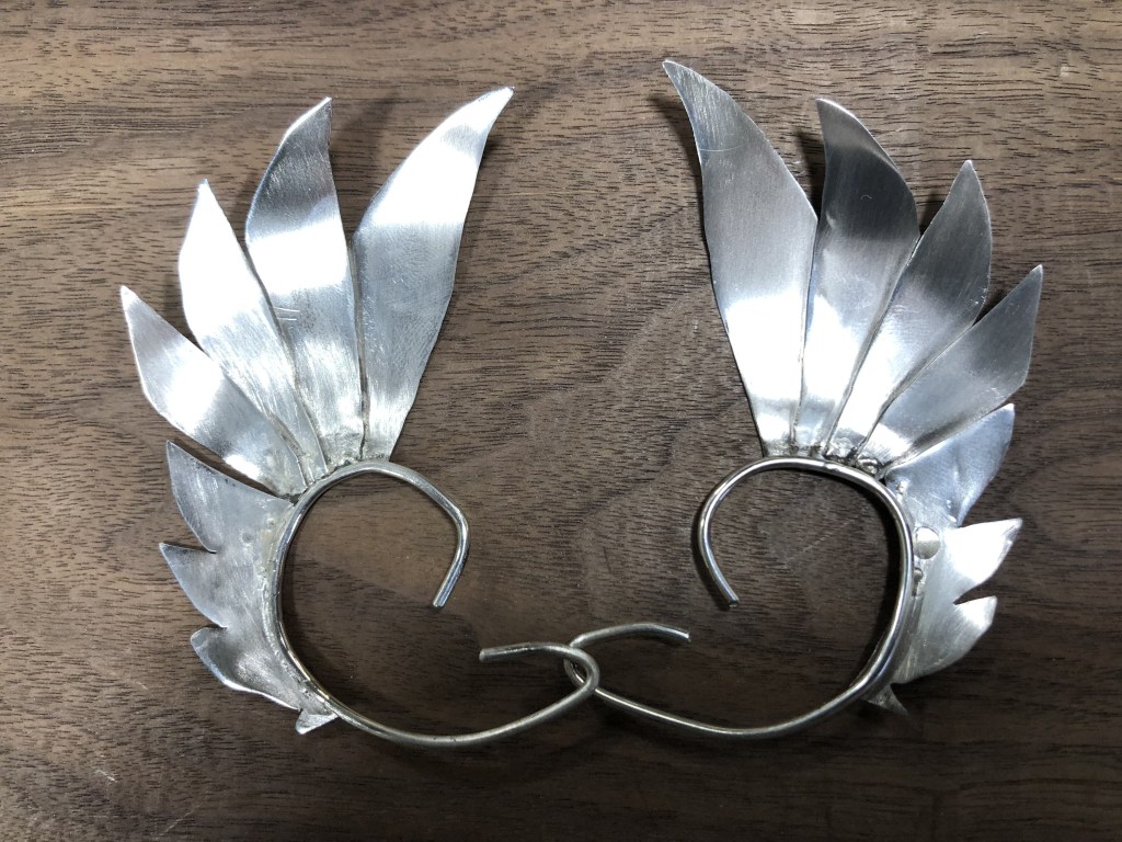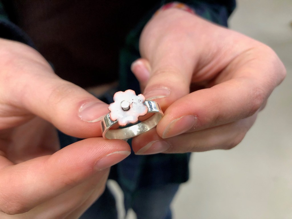 Some incredible projects from our Spring 2022 Jewelry 11/12 crew! Fidget ring featuring copper enamelled flower with a handmade sterling rivet made by S.V., Sterling silver feathered earcuffs made by K.C. (and worn to their grad ceremony in June!), and a stone set pendant by W.J.. Great job, everyone!