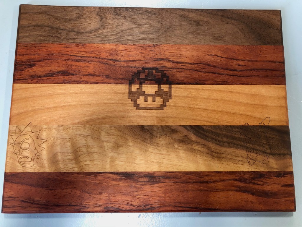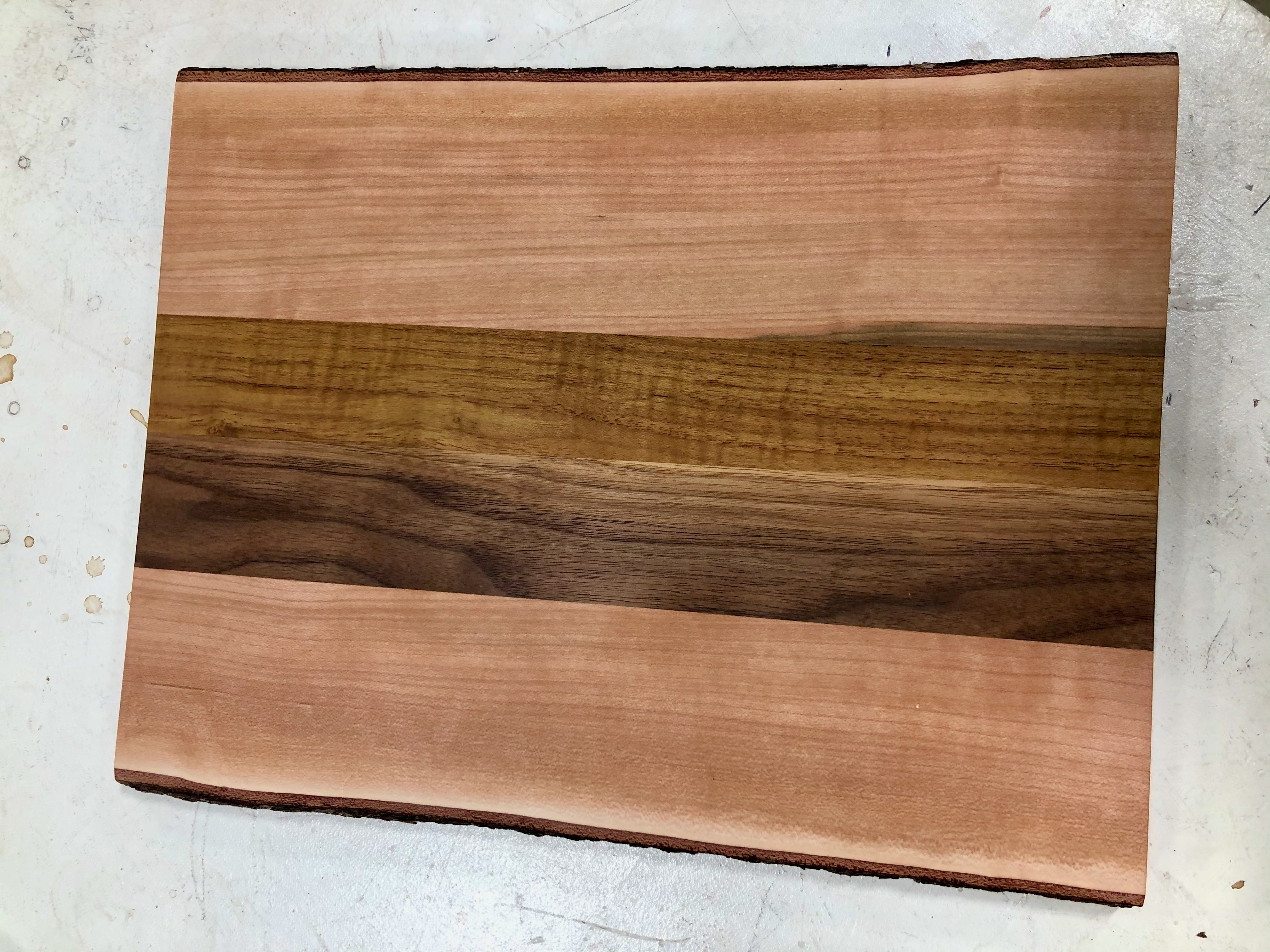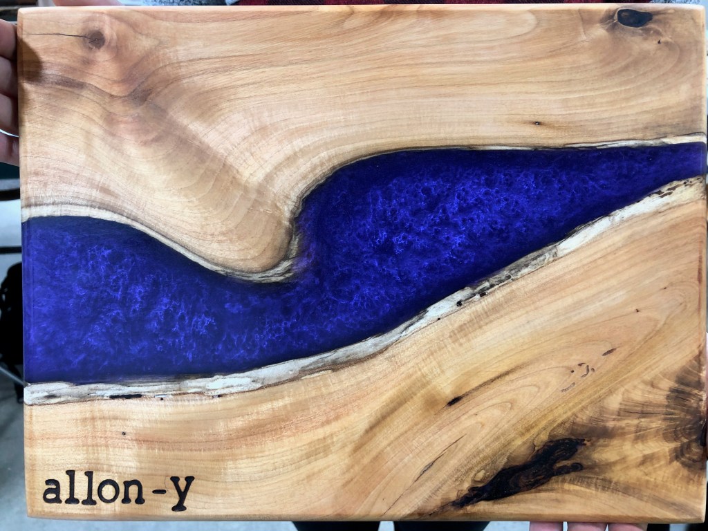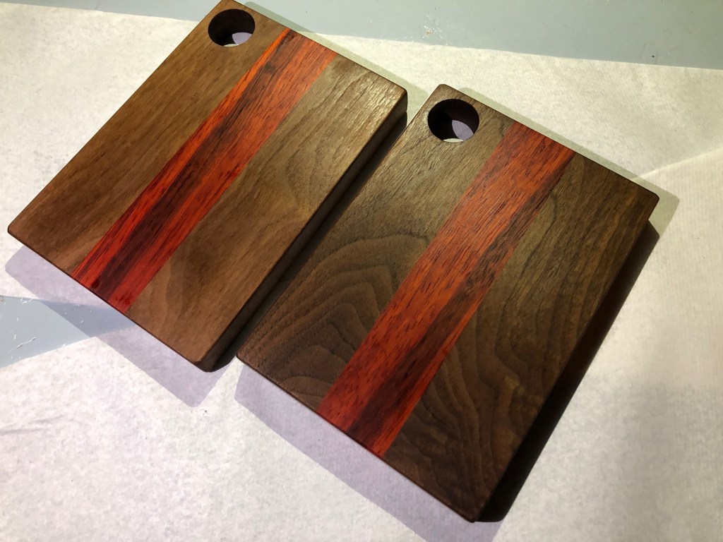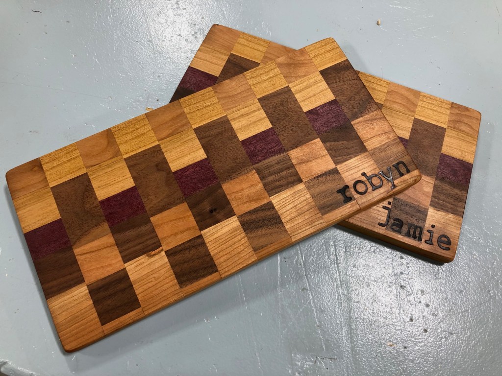 All project dimensions, wood species, and details were chosen and designed by students. Of particular note are L.P.’s intricate moon woodburning, the gorgeous cherry and padouk serving platter with flower woodburning, S.G.’s live-edge platter, and L.S. overcoming some huge challenges and frustrations with her amazing chevron cutting board. WOW! Wonderful job, folks!