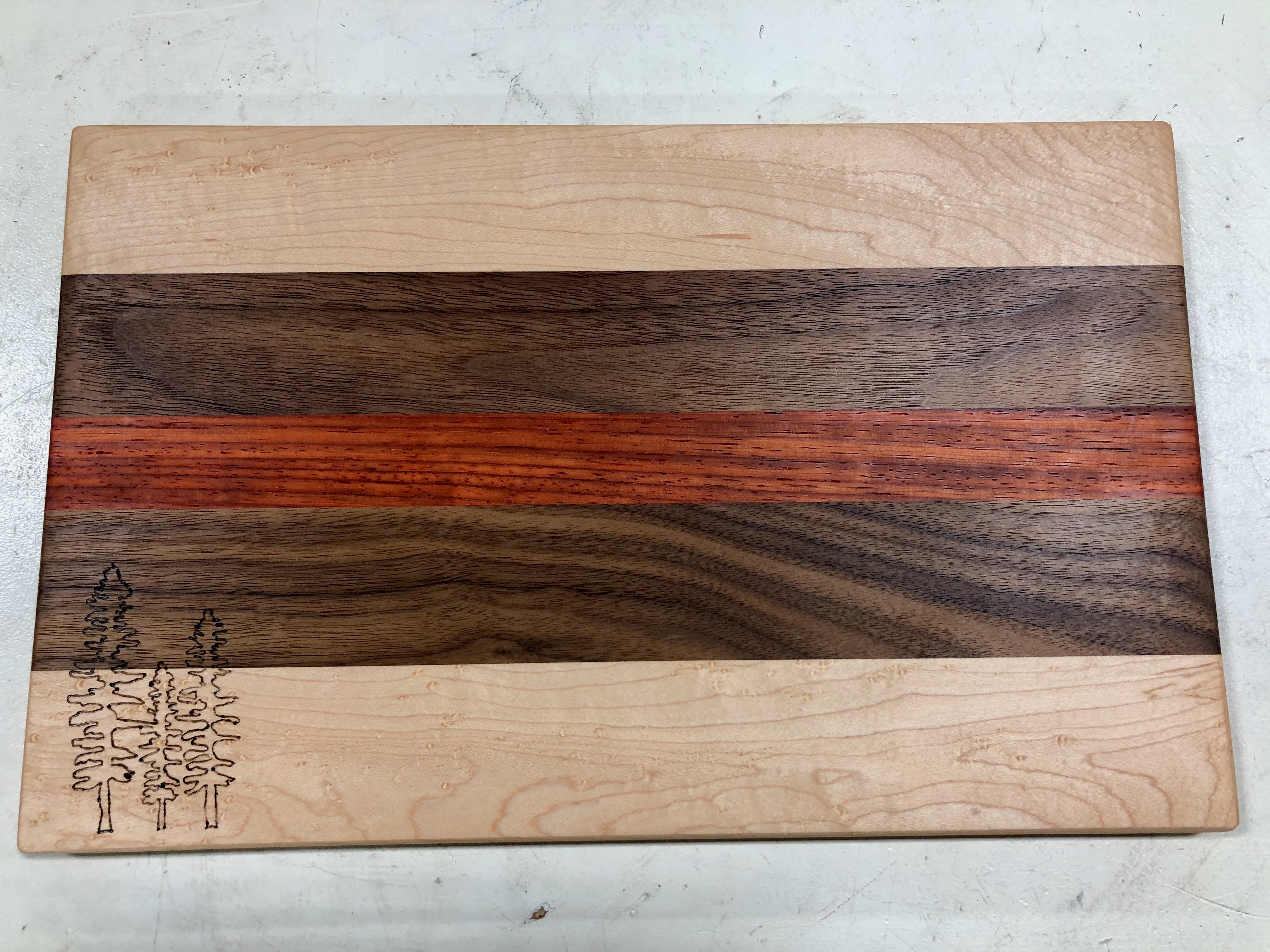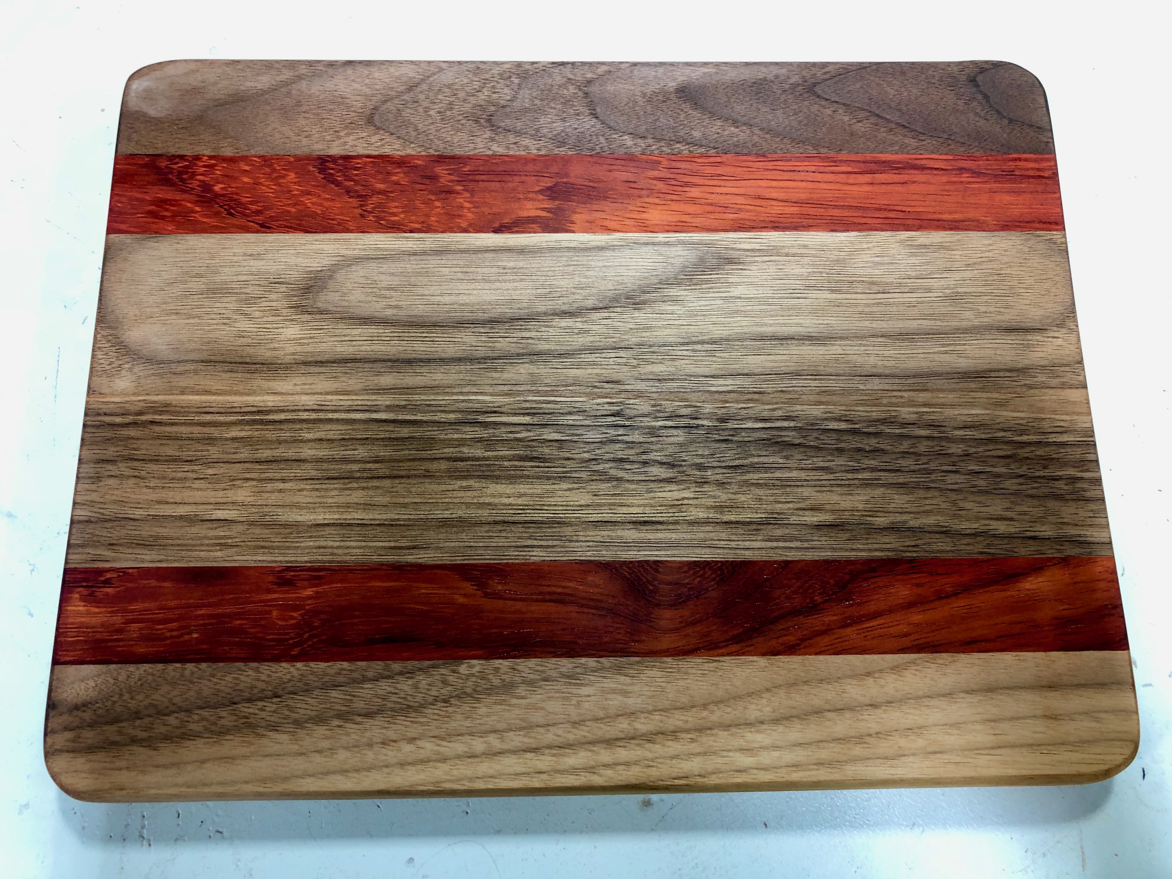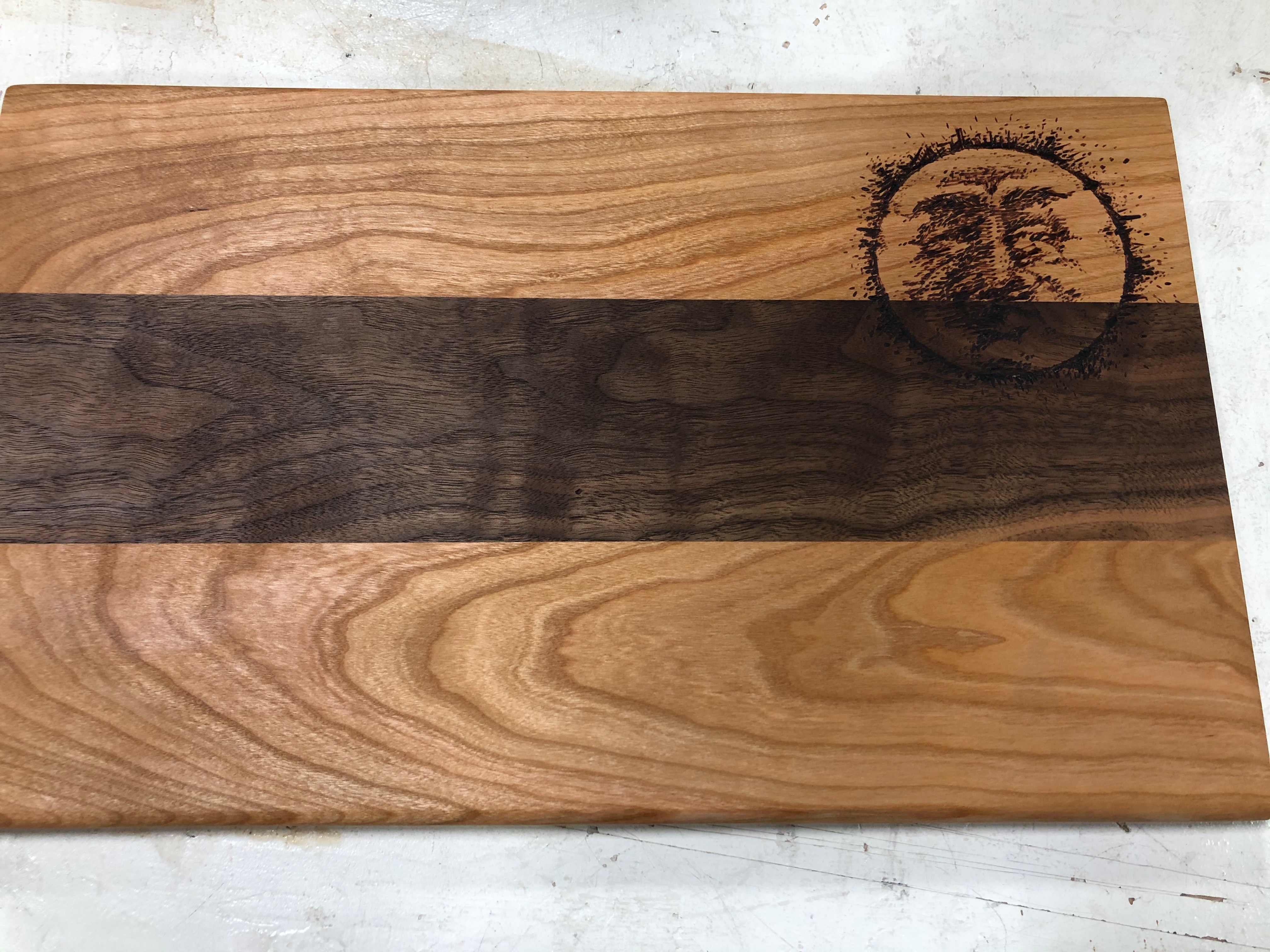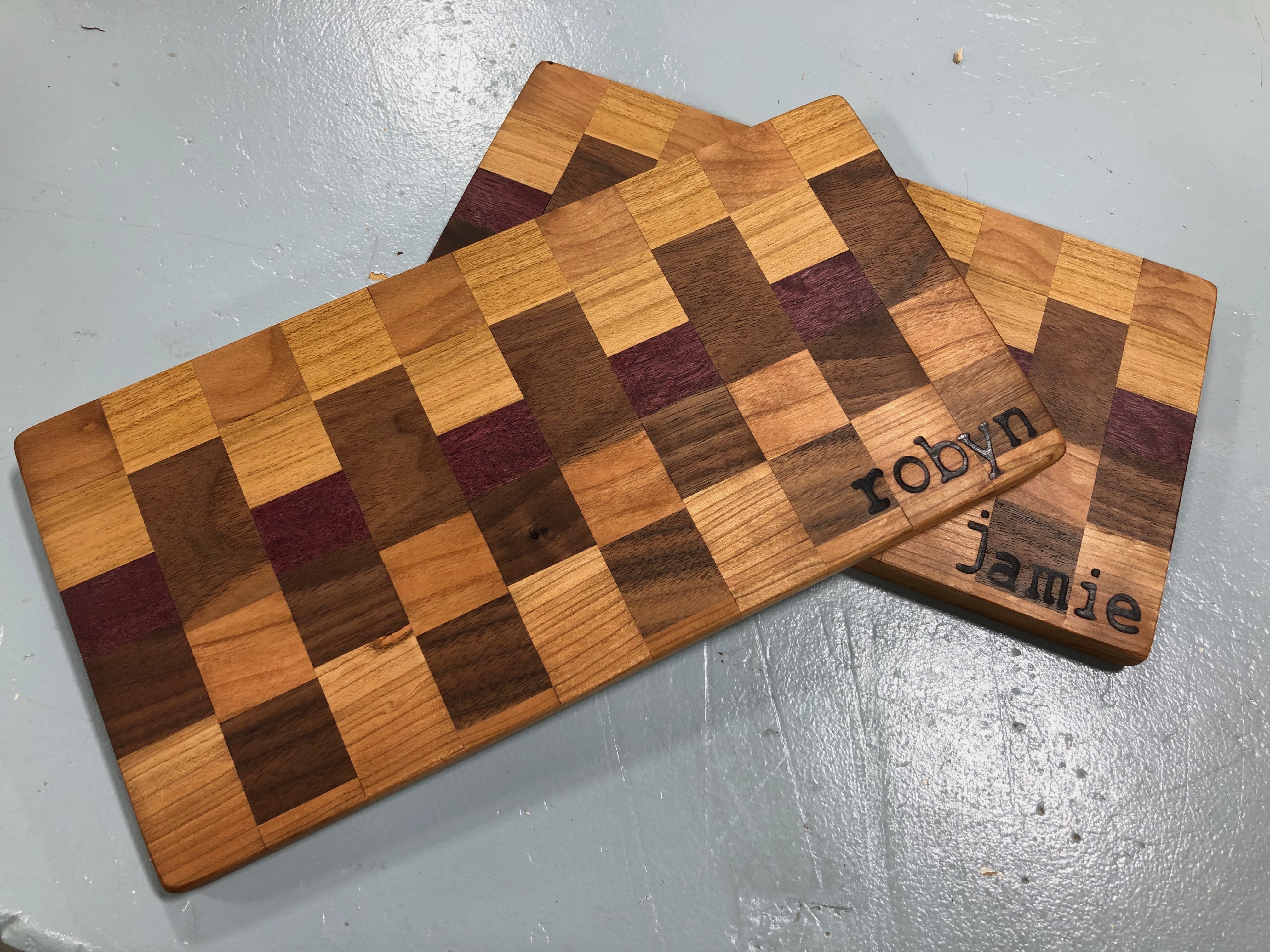 All project dimensions, wood species, and details were chosen and designed by students. Of particular note are L.P.’s intricate moon woodburning, the gorgeous cherry and padouk serving platter with flower woodburning, S.G.’s live-edge platter, and L.S. overcoming some huge challenges and frustrations with her amazing chevron cutting board. WOW! Wonderful job, folks!