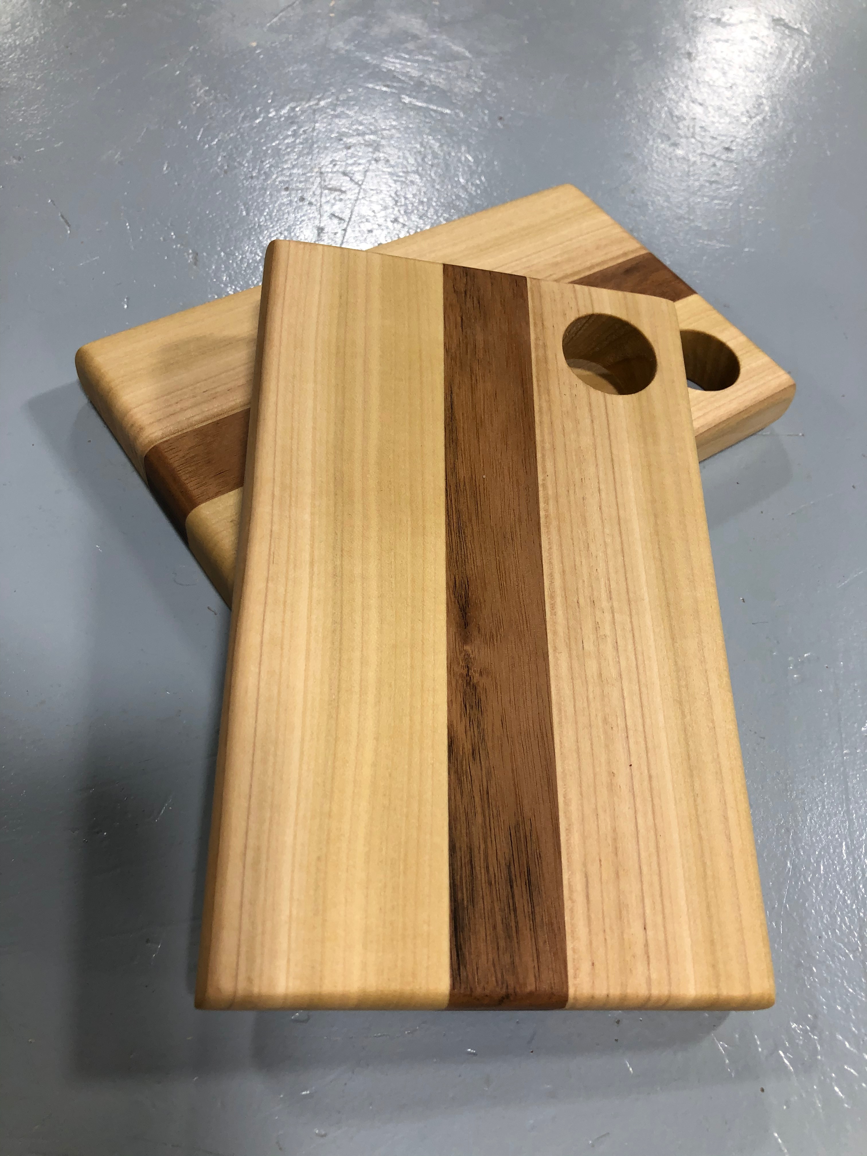 These cutting boards were many students’ FIRST-ever woodworking projects. Students design their dimensions, wood types, and layout, and learn most of our bigger machines (jointer, planer, table saw, mitre saw) through this project, as well as foundational laminating and layout skills. Beautiful work, everyone!