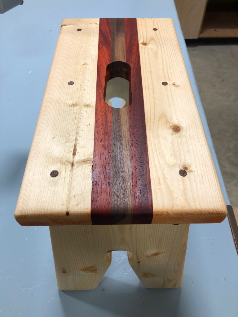 One of our 2019 skill-builders in Woodwork 9/10 is a step stool – this project incorporates skills including angled table saw cuts, drill press and bandsaw shaping, jigsaw slot-cutting, and dowel-cutting. Students choose their wood species, and they all turned out beautifully! Awesome work, everyone.