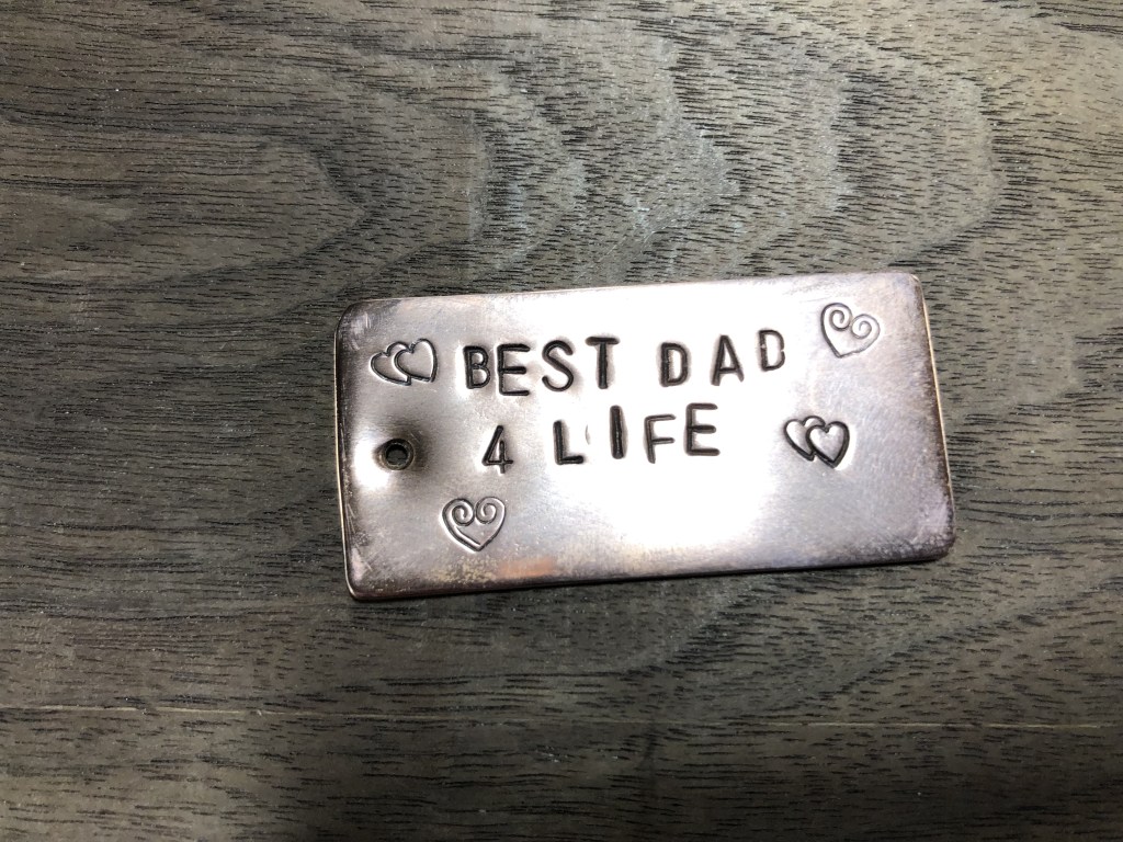 This touching memorial ornament was commissioned by fellow teacher and counselor J.B. for her late father’s memorial tree. Students L.J. and K.C. took on this project and used letter stamps for the inscription, liver of sulfur to darken the letters, and some gorgeous wirework and an added heart charm hanging from the bottom. J.B. was incredible touched, and will cherish this gift. Thank you so much, L.J. and K.C. for being so keen to create this!
