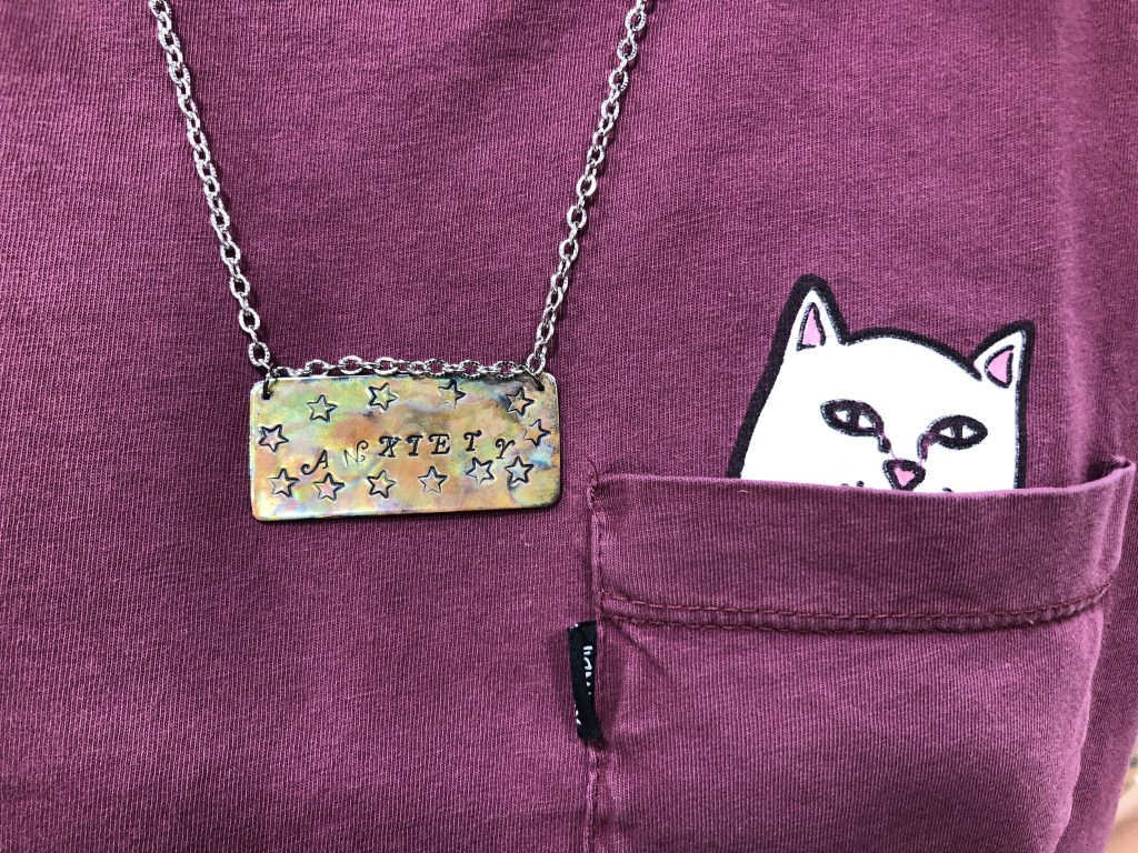 In Spring 2018, we had a professional jeweller and college instructor, Cheryl Jacobs, come into our class to talk about local advanced education and entrepreneurship in jewelry-making (See the “Other Awesome Resources” section on this website to view her work). Cheryl shared new skills with us, and worked with students in both Junior and Senior Jewelry. Pictured here are a variety of cuffs designed by students – these projects incorporated leather work, riveting, and texturing and tempering metal.